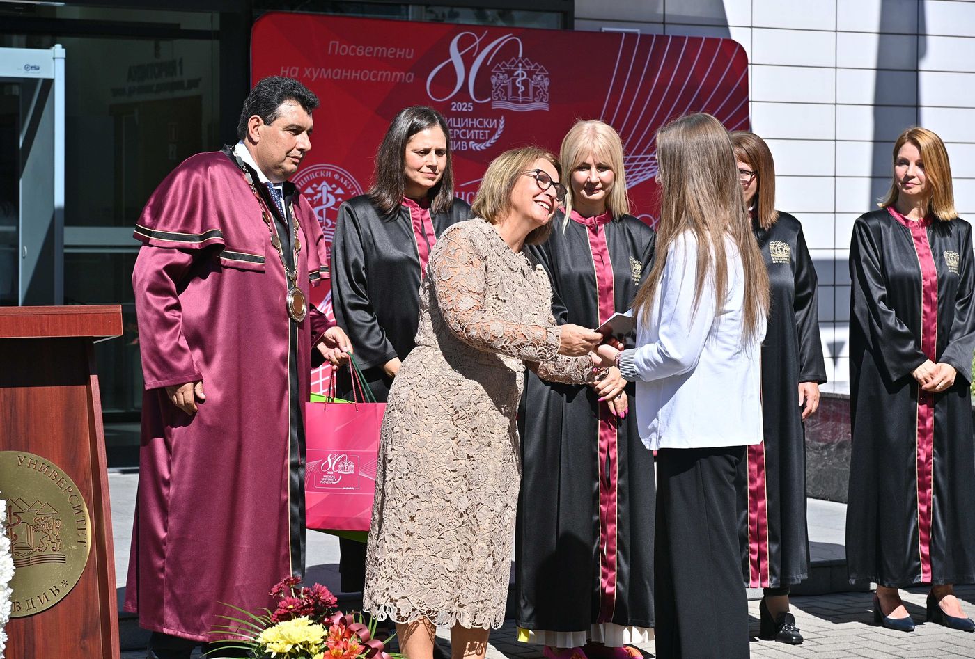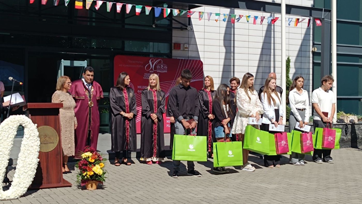 Областният управител проф. Христина Янчева и ректорът проф. д-р Ангел Учиков връчиха студентските книжки и подаръците на отличниците с най-висок бал от четирите факултета – Рафаела Панайотова – Медицински факултет, Ясемин Имам – Факултет по дентална медицина, Илиян Пачев -Фармацевтичен факултет, Анелия Георгиева – Факултет по обществено здраве, Мира Петрова – Медицински колеж.