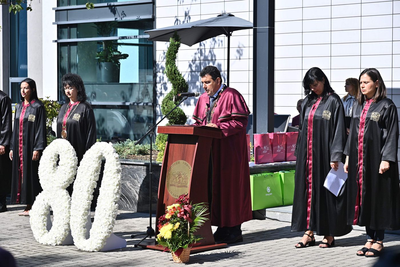 Ректорът отбеляза пред присъстващите, че тази година висшето училище чества 80 години от основаването си – 80 години история, 80 години посвещаване на науката, на знанието и на хуманността.