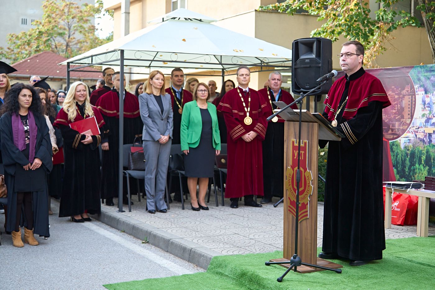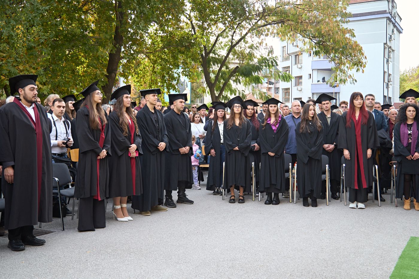 „Днес е ден на благодарност, радост и удовлетворение от постигнатото. Завършва един важен етап на труд и усилия от вашия живот и започва нов, пътят на професионалната реализация, мечтите и личните успехи. Днес празнуваме вашето израстване като личности и специалисти“, посочи в приветствието си по повод промоцията на „Випуск 2025“ ректорът на УХТ проф. Галин Иванов.