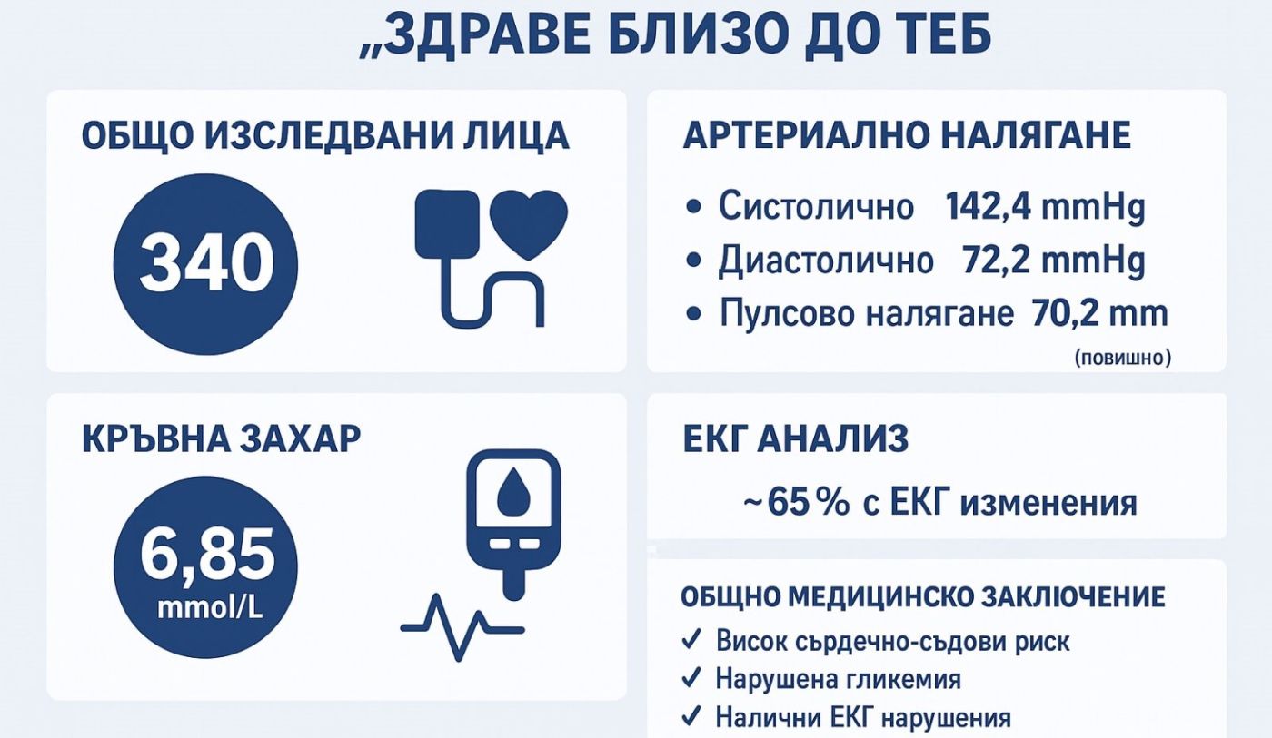 „Според резултатите 65% от изследваните лица са с артериална хипертония, която често остава недиагностицирана и създава риск от сърдечно-съдови заболявания. Същият процент са и участниците с повишени нива на кръвна захар, включително предиабетни и диабетни стойности. Наблюдават се ЕКГ изменения, характерни за хроничен сърдечен стрес и повишено натоварване“, коментира проф. Янчева. По думите й резултатите потвърждават необходимостта от продължаване на инициативите за ранна диагностика и превенция. Важно е и хората да се грижат за здравето си като залагат на правилно хранене и повече движение.